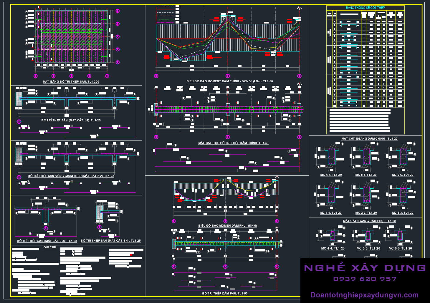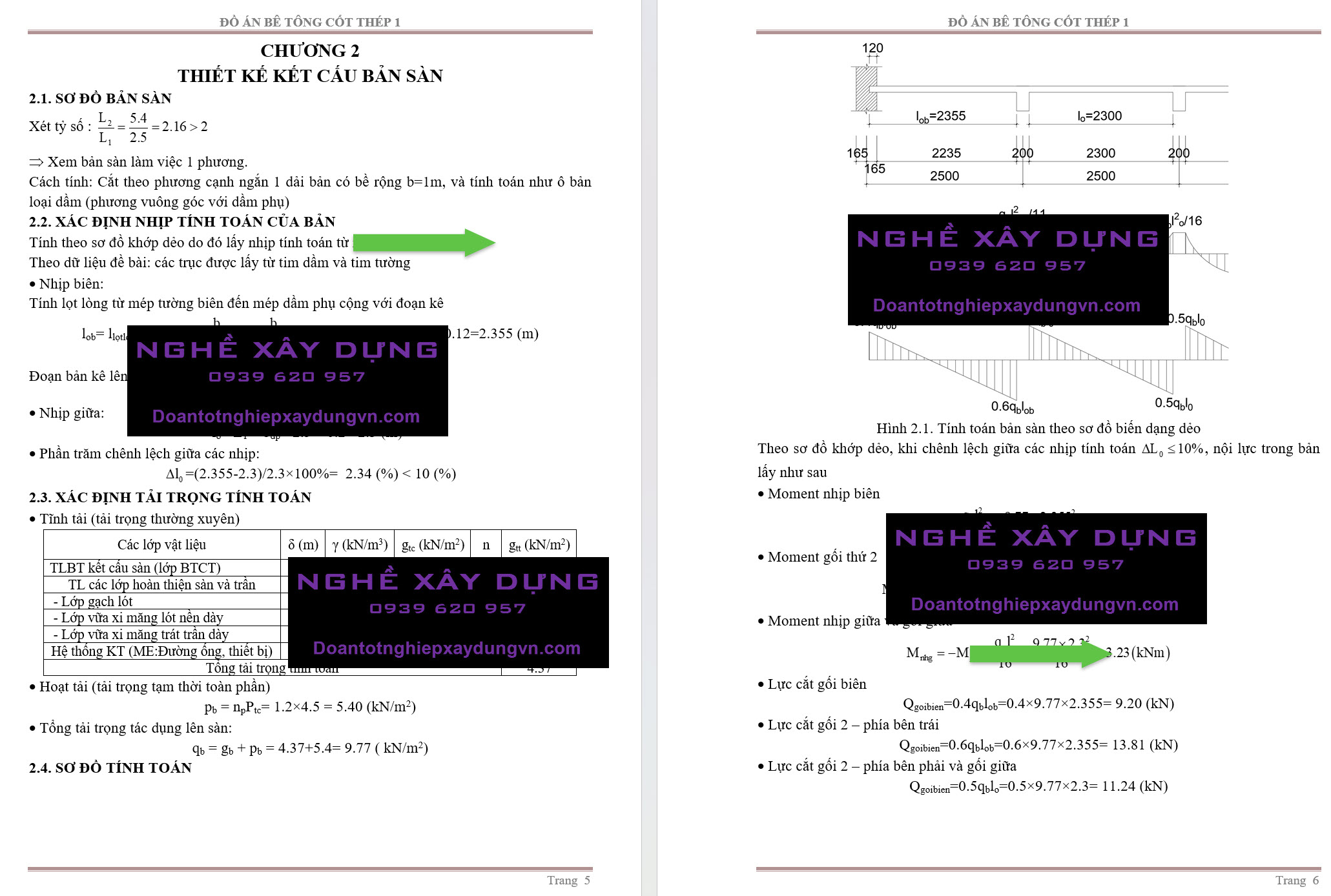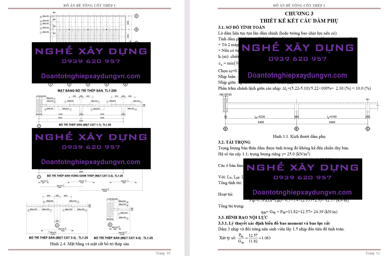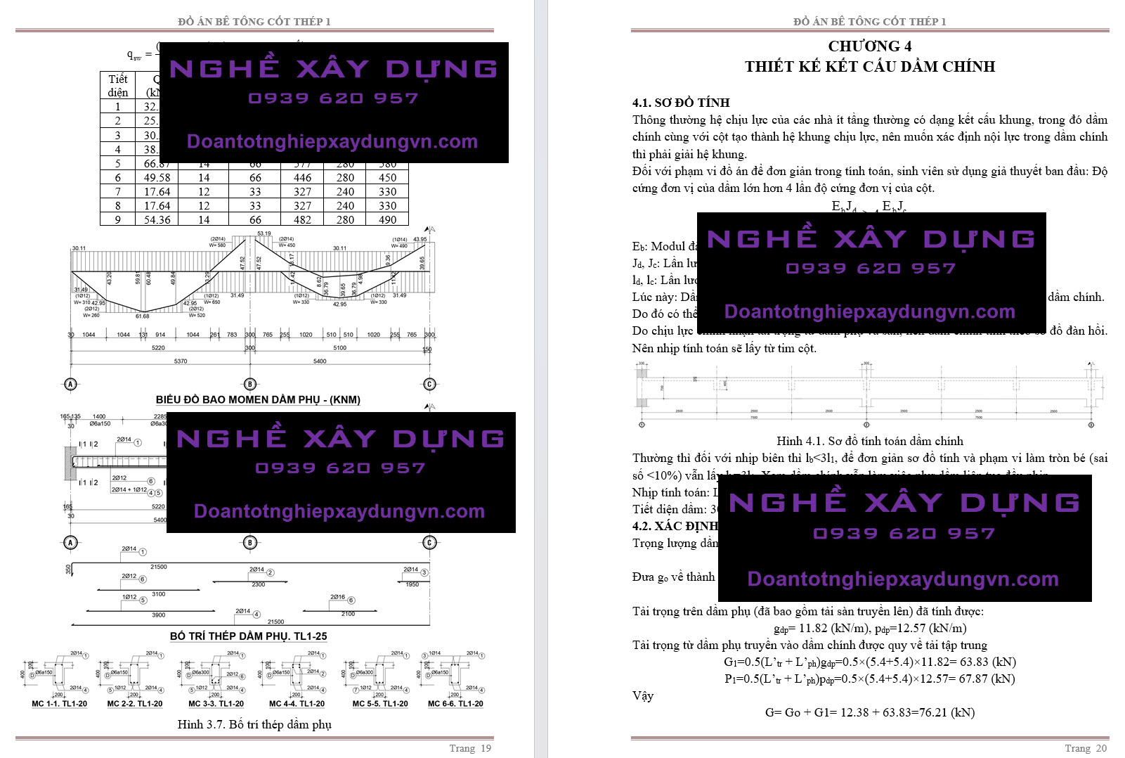 1. Xử lý số liệu đề bài + Giải pháp vật liệu + Cơ sở lý thuyết tính toán cốt thép: Cốt thép dọc và cốt thép đai + Cấu tạo cốt thép trong dầm chính và dầm phụ + Nguyên tắc neo, nối cốt thép + Sơ bộ kích thướt tiết diện các cấu kiện: sàn – dầm – cột 2. Thiết kế kết cấu sàn + Sơ đồ tính bản sàn + Xác định nhịp tính toán + Xác định tải trọng tính toán + Tính thép cho bản sàn: Thép dọc: Tính toán vùng giảm thép Thép đai (Kiểm tra khả năng chịu cắt của sàn) + Nguyên tắc bố trí thép sàn: Thép chịu lực Thép cấu tạo Thép theo phương cạnh dài Neo cốt thép: Tính toán chi tiết 3. Thiết kế kết cấu dầm phụ + Sơ đồ tính + Xác định tải trọng + Xác định hình bao nội lực (Tra bảng): moment và lực cắt + Tính thép cho dầm Thép dọc: tính theo tiết diện chữ T Thép đai, cốt thép ngang: Công thức tính toán theo TCVN5574:2018 + Tính khả năng chịu lực của tiết diện và vẽ biểu đồ bao vật liệu + Xác định đoạn kéo dài cốt thép (Sử dụng lực cắt tại tiết diện cắt lý thuyết) 4. Thiết kế kết cấu dầm chính + Sơ đồ tính + Xác định tải trọng + Tính và vẽ biểu đồ bao moment và biểu đồ bao lực cắt Sử dụng phần mềm Etabs để vẽ các trường hợp tải trọng Sau đó xuất nội lực từng trường hợp Vẽ chồng tất cả các biểu đồ momen (lực cắt) vào cùng một trục, cùng một tỷ lệ Lúc này biểu đồ bao chính là nhánh bao ngoài cùng + Tính thép cho dầm Thép dọc: tính theo tiết diện chữ T và có sử dụng cốt thép giá Thép ngang: Thép đai và cốt treo dạng đai + Tính khả năng chịu lực của tiết diện và vẽ biểu đồ bao vật liệu + Xác định đoạn kéo dài cốt thép (Sử dụng lực cắt tại tiết diện cắt lý thuyết)